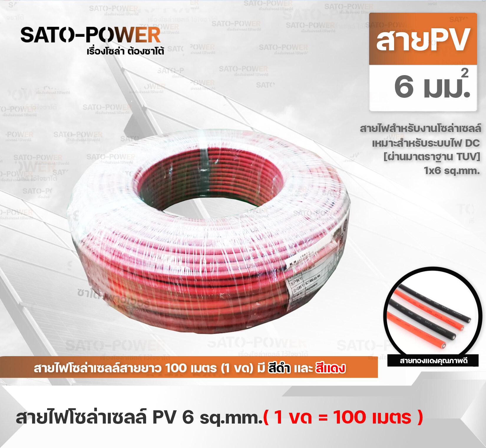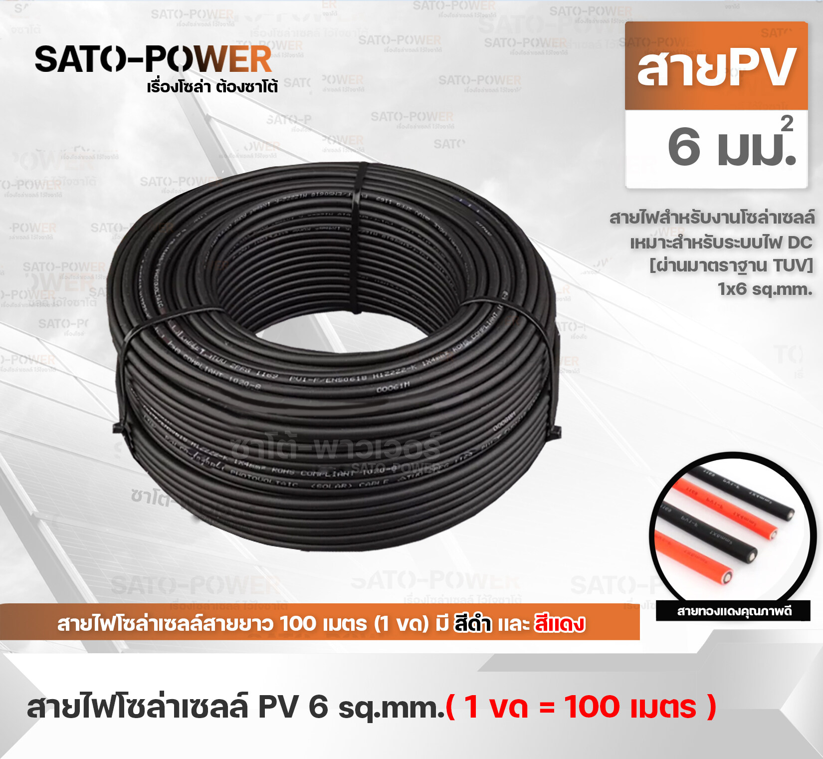 สายไฟโซล่าเซลล์ SOLAR CABLE PV CABLE- ออกแบบมาใช้กับระบบ Solar Cell โดยเฉพาะ- ทองแดงแท้เคลีอบดีบุก ( DC 1500V )- ฉนวน2 ชั้น ทนความร้อนได้สูงสุดถึง 90 °C- เปลือกนอกเป็น XLPE-LSZH , UV Resistance, Water Resistance- รับประกัน 30 ปี- ผ่านมาตรฐาน TUV , EN 60288 , Class5 , RoHsสายไฟโซล่าเซลล์ SOLAR CABLE PV CABLEขนาด 1x4.0 sq.mmรูปร่างวัสดุ เป็นเส้นกลมวัสดุหลัก ลวดทองแดงความหนาฉนวน 0.8 มม.PV1-F 1x4.0 sq.mmผ่านมาตรฐาน TUV , EN 60288 , Class5 , RoHsหุ้มด้วยฉนวนกันความร้อน 2 ชั้นสายไฟเป็นทองแดงแท้เคลือบด้วยดีบุกสามารถทนกระแสได้สูงถึง 55Aทนอุณหภูมิต่ำสุด -40 องศาเซลเซียสทนอุณหภูมิสูงสุด 120 องศาเซลเซียส