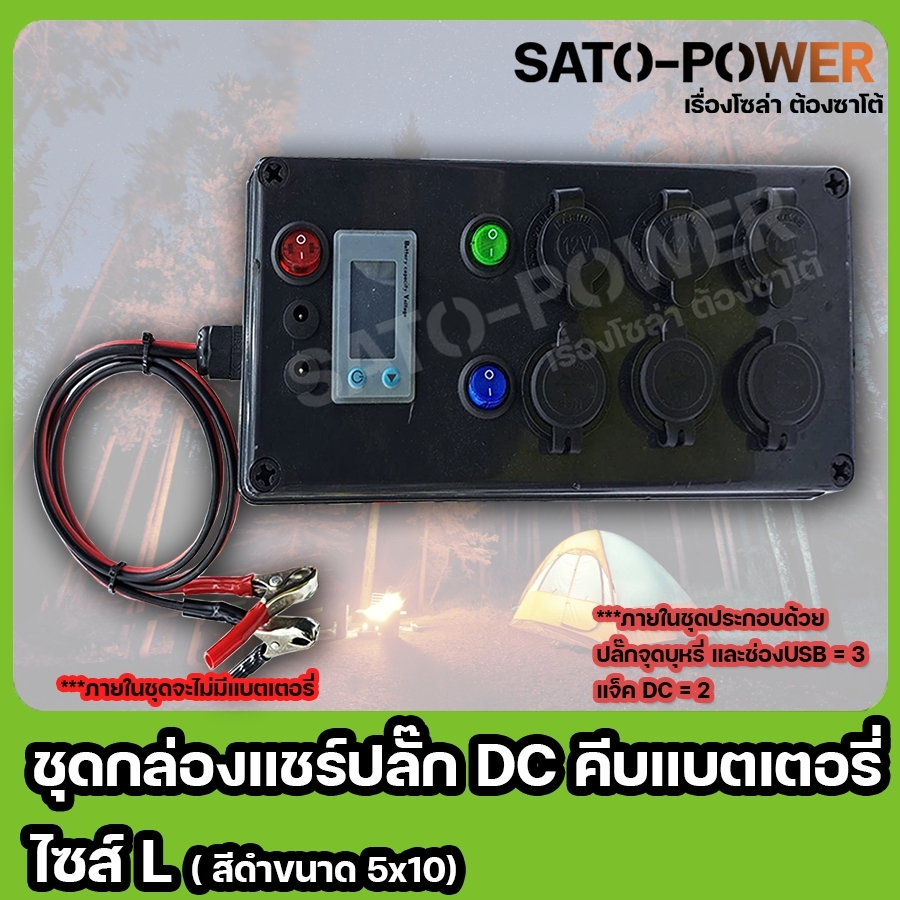 ชุดกล่องไฟ DC คีบเเบตเตอรี่ ไซส์ L + ปลั๊ก12V + ช่อง USB + เเจ็ค DC ( กล่องสีดำ ขนาด 5x10 )