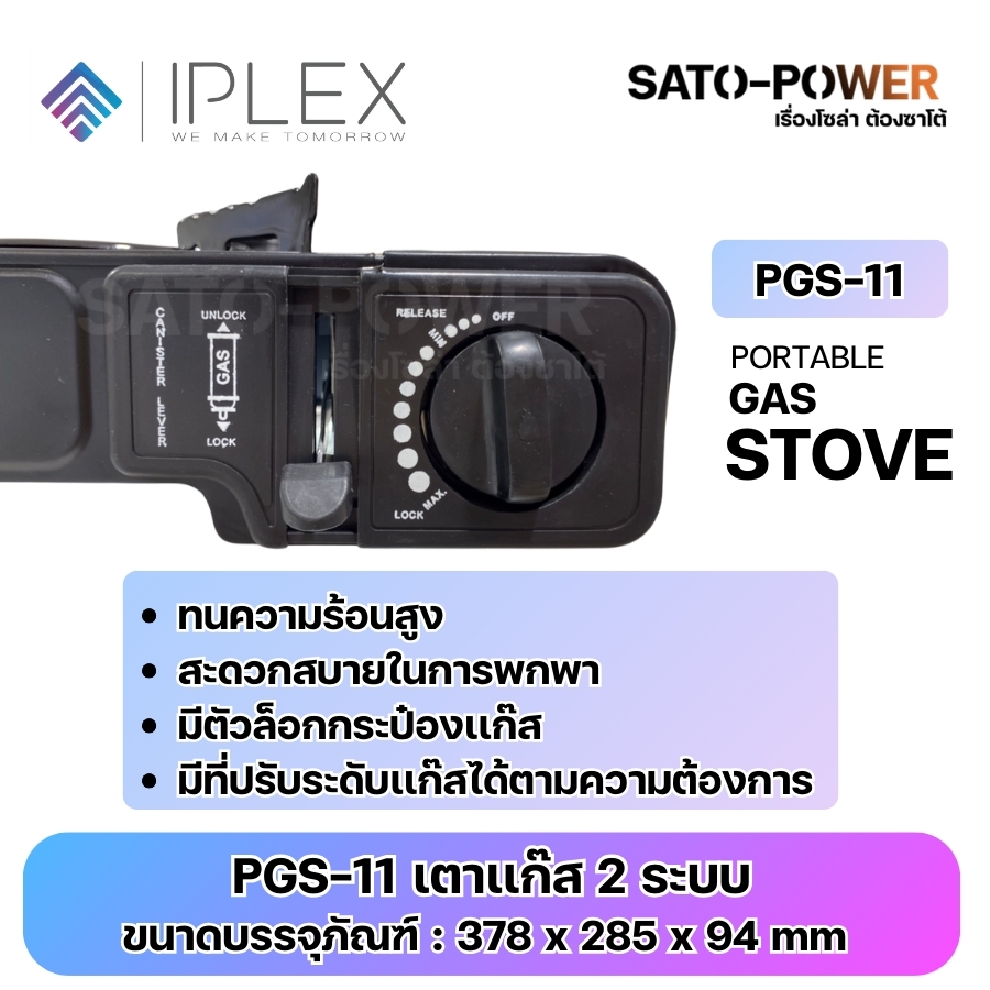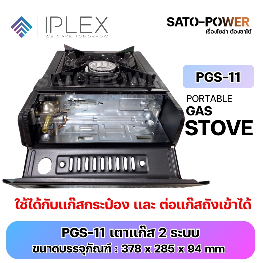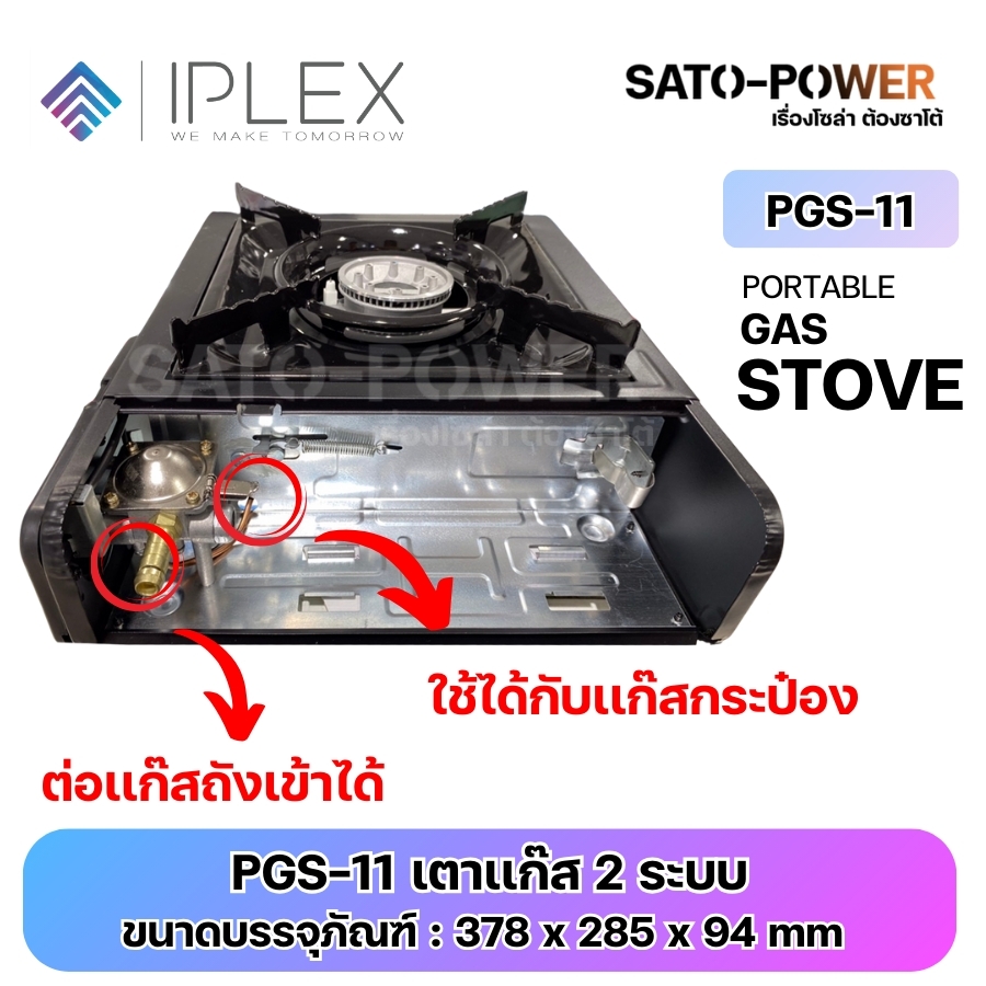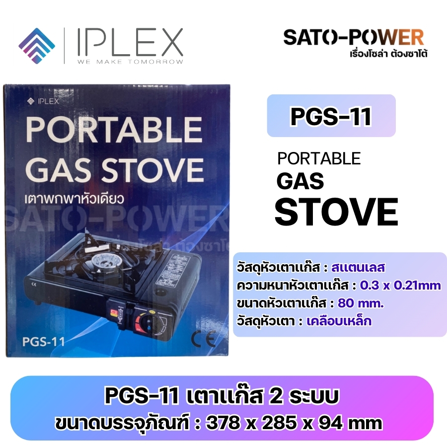 IPLEX PORTABLE GAS STOVE เตาพกพาหัวเดียว PGS-11 | วัสดุหัวเตาแก๊ส สแตนเลส | ความหนาหัวเตาแก๊ส 0.3 x 0.21mm | ขนาดหัวเตาแก๊ส 80 mm. | วัสดุหัวเตา เคลือบเหล็ก | ขนาดบรรจุภัณฑ์ : 378 x 285 x 94 mm |ใช้ได้กับแก๊สกระป้อง และ ต่อแก๊สถังเข้าได้