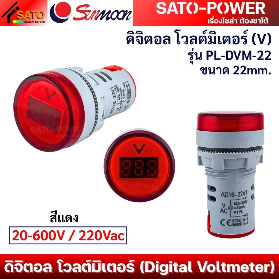 SUNMOON ดิจิตอล โวลต์มิเตอร์ (V) | 20-600V / 220Vac | รุ่น PL-DVM-22 ขนาด 22mm.